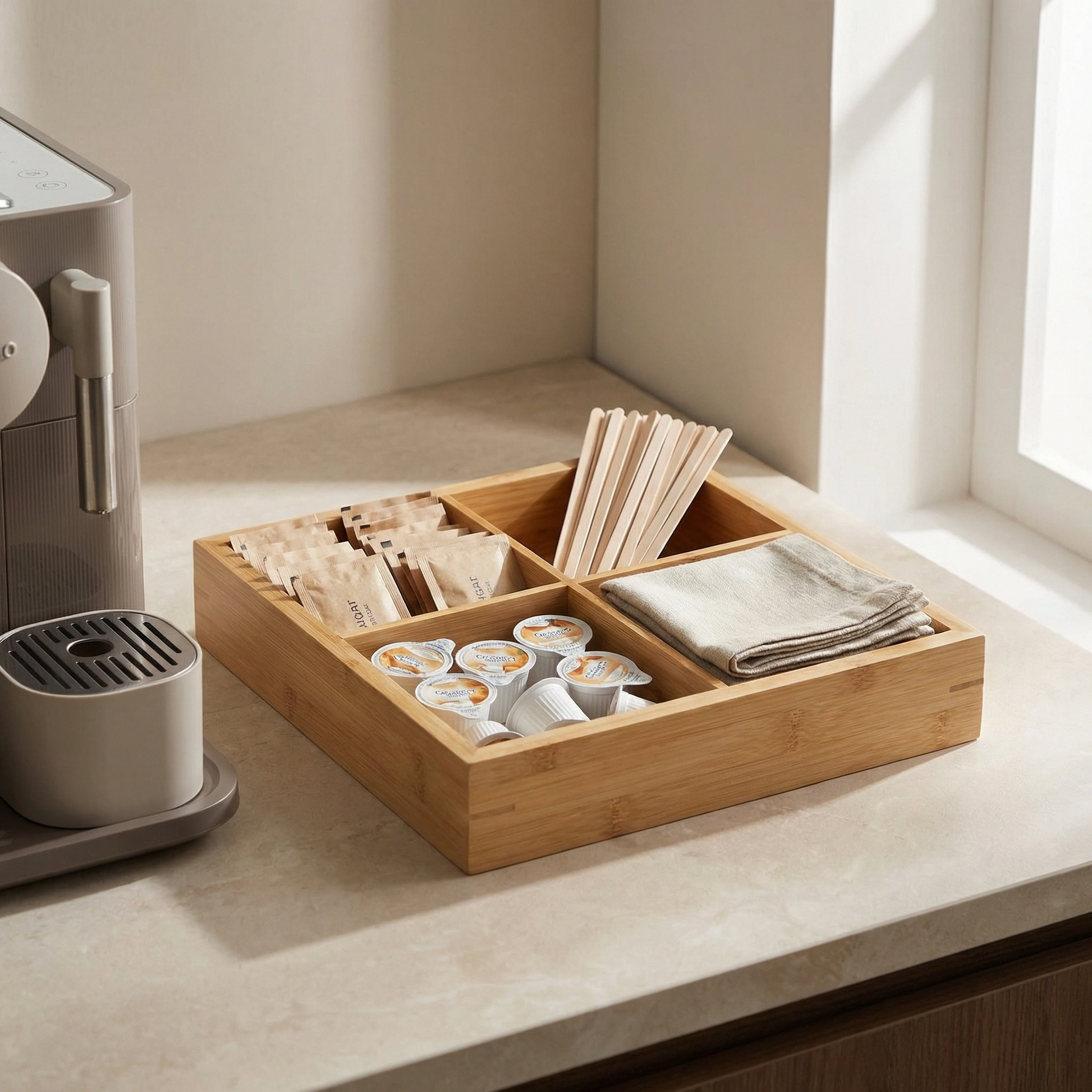 This tray consolidates them. One spot, separate compartments. Everything you need is within reach instead of scattered across the counter.