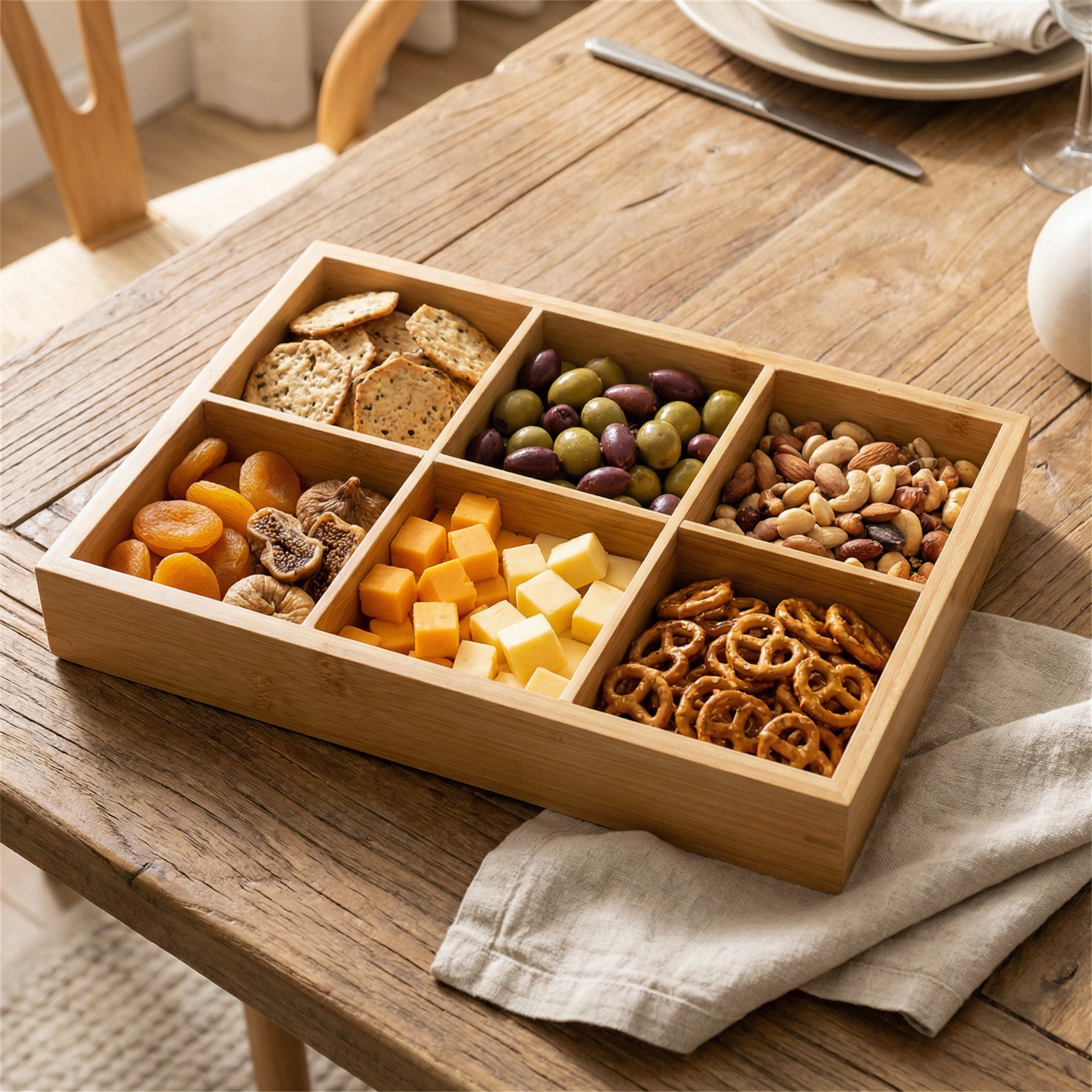 Use it for coffee station supplies — sugar packets, stirrers, creamers, napkins. Or snacks during movies — popcorn, candy, chips, pretzels. Or breakfast toppings — granola, berries, nuts, seeds. The sections work for anything you'd normally put in separate bowls but want consolidated in one spot.